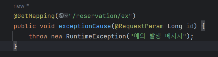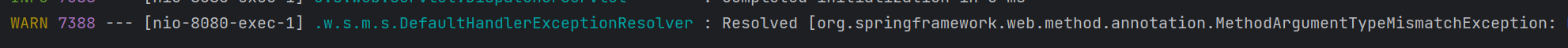 해당 컨트롤러는 요청이 들어왔을 때, 기본적으로 RuntimeException을 발생시킨다. 하지만 throw 코드가 실행되기 전에, 쿼리 파라미터에 바인딩되는 타입이 일치하지 않아 발생하는 예외를 HandlerExceptionResolver 중 하나인 DefaultHandlerExceptionResolver가 처리하게 된다.