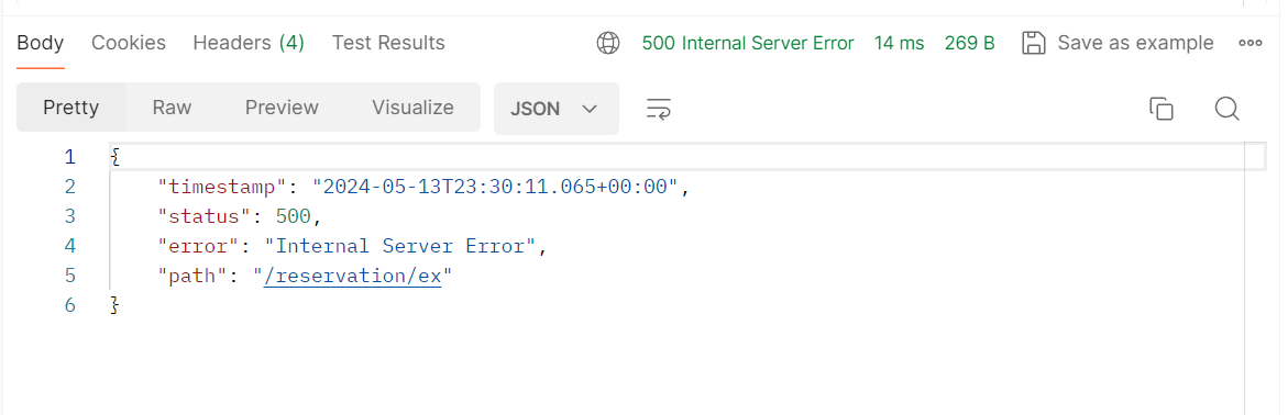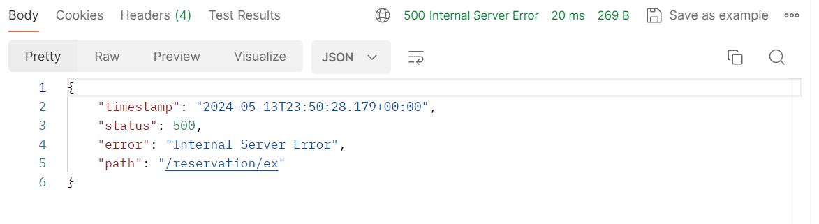 쿼리 파라미터에 정상적인 값을 요청했을 경우, throw 코드가 정상적으로 실행되어 앞서 언급했던 BasicErrorController에 의해 기본적인 에러 JSON이 응답되고 있다.