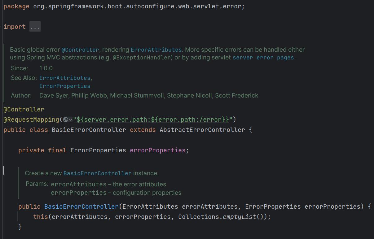 이 때, WAS는 예외가 발생한 걸 감지하고 /error (기본설정 경로이며, properties / yaml 파일로 변경 가능) 로 다시 요청을 보낸다. 그러면 해당 요청을 스프링부트에서 구현한 BasicErrorController에서 받게 된다.