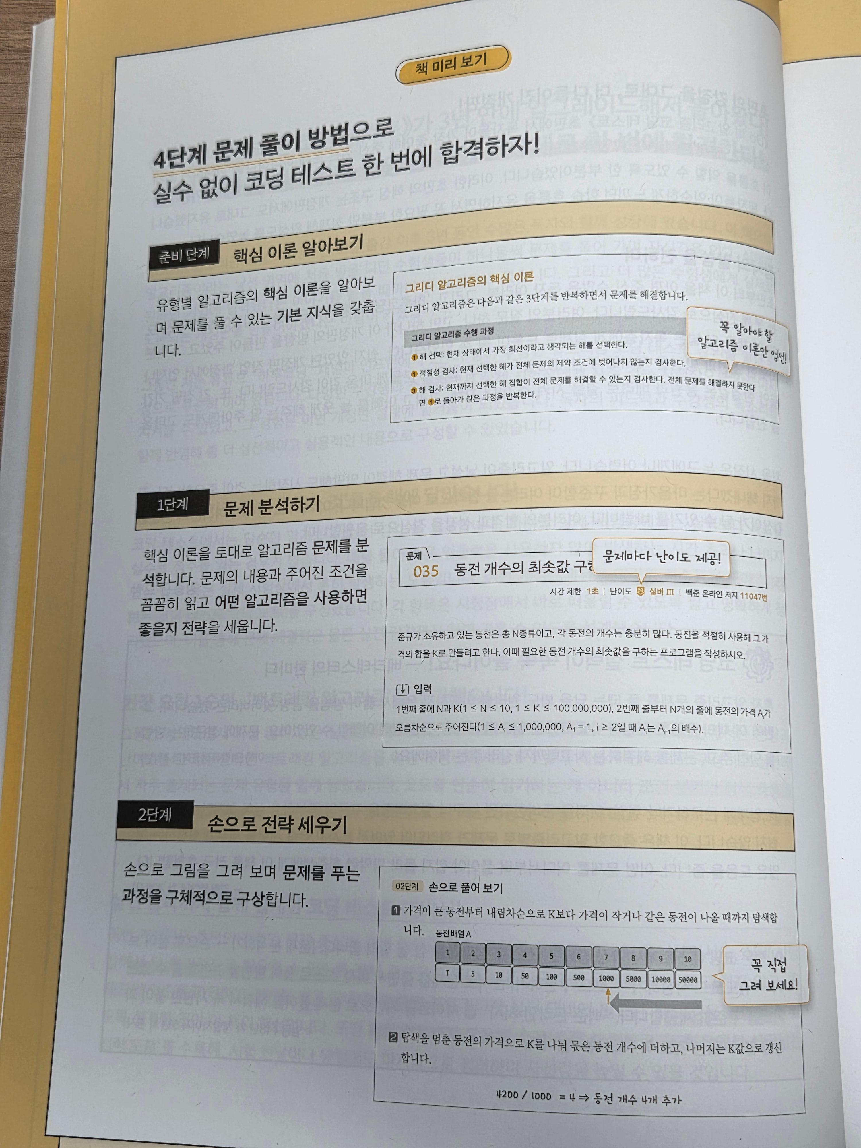 이 책은 문제 분석하기 → 손으로 풀어보기 → 수도코드 작성하기 → 코드 구현하기라는 체계적인 4단계 학습법을 제시합니다. 하지만 필자의 경우, 그동안 여러 코딩 테스트 책으로 공부하면서 글과 그림만으로는 문제와 풀이 과정을 이해하기가 어려웠습니다. 난이도에 따라서 여러 번 읽어야 이해가 되는 경우가 많았습니다. 하지만 'Do it! 알고리즘 코딩 테스트'는 이러한 단점을 해소할 수 있는 부분이 있습니다. 바로 해당 풀이를 바탕으로 저자의 설명 영상이 유튜브에 무료로 공개되어 있기 때문입니다. 책에서 미처 다 이해하지 못한 부분을 영상으로 직접 보며 저자의 의도를 충분히 이해할 수 있었습니다.
