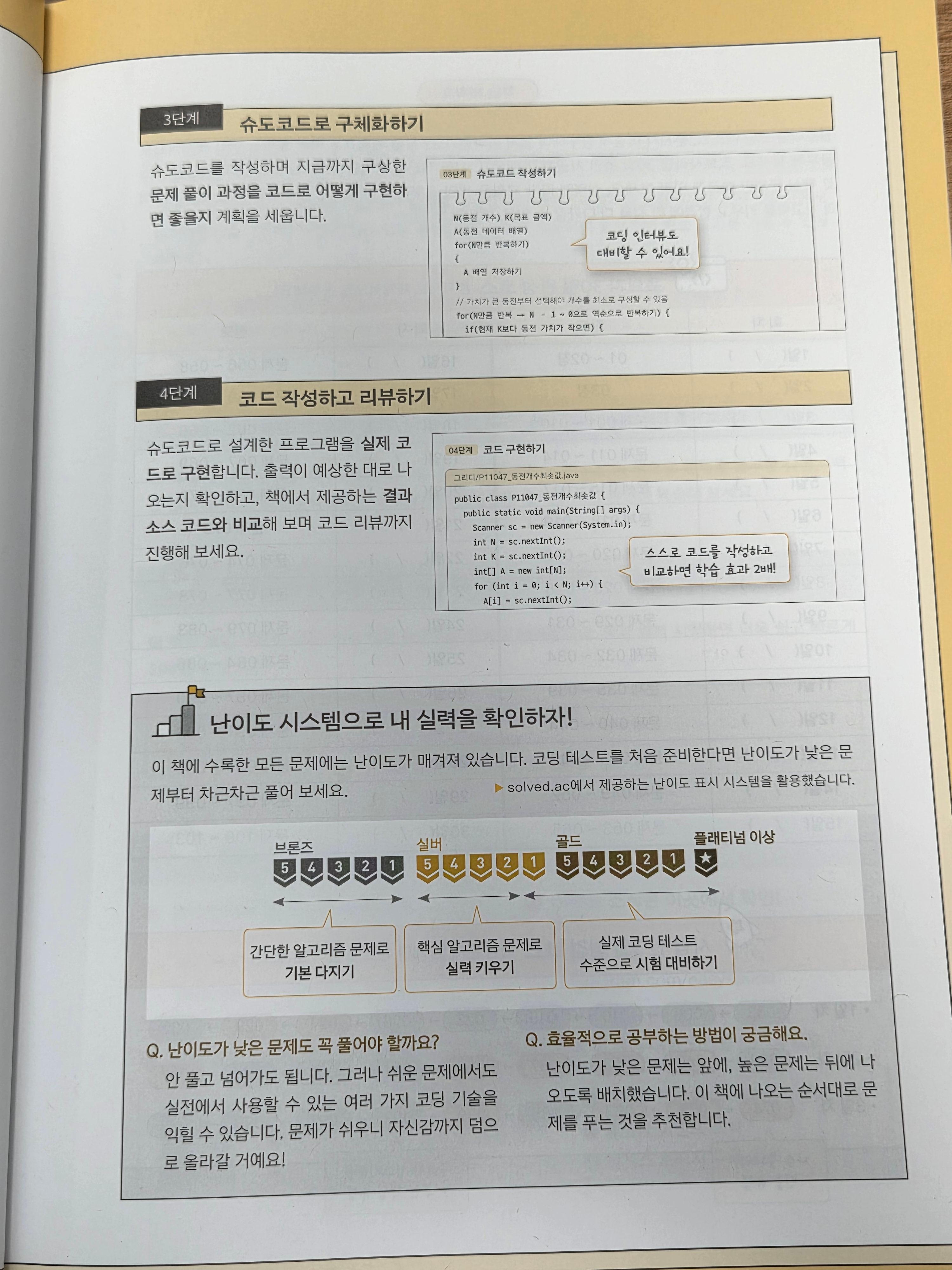 또한, 슈도 코드로 구체화한 후에 알고리즘 코드를 제시하기 때문에 코드를 이해함에 있어서도 다른 책들과 비교했을 때 훨씬 수월했습니다. 간혹, 자바의 스트림 문법을 극한으로 활용해 답안 코드를 제시하는 책들이 있는데, 책에서 소개한 개념과 코드를 연결시키기 어려웠던 부분이 있었습니다. 하지만, Do it 책은 입문자도 쉽게 접근할 수 있도록 알고리즘 코드를 구현하고 있기에 좀 더 진입장벽이 낮다고 느꼈습니다.